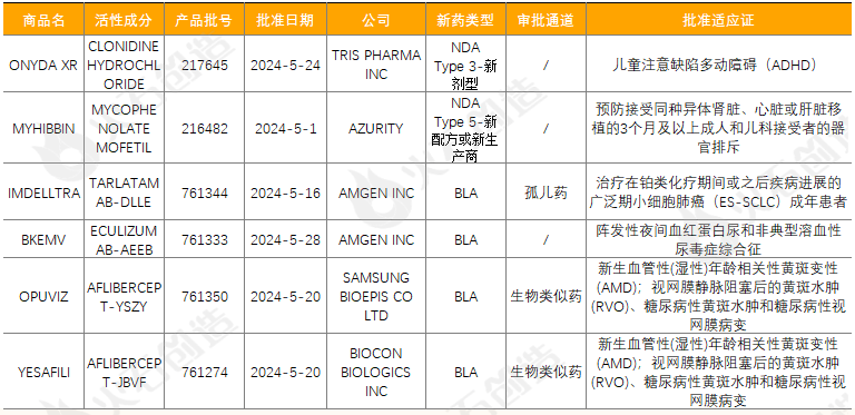 如图1,截至2024年6月5日FDA官网披露,2024年5月FDA共完成76项药品首次批准(不包含暂时批准),其中NDA/BLA批准6款(不包含暂时批准),见表1。其中包括0款新获批的新分子实体药物(NDA:Type 1 - New Molecular Entity),4款生物制品药物(BLA)。2024年5月,美国安进公司斩获2款新药,分别为IMDELLTRA和BKEMV。IMDELLTRA作为全球首款小细胞肺癌双靶点靶向药Tarlatamab获FDA加速批准,用于治疗在铂类化疗期间或之后疾病进展的广泛期小细胞肺癌(ES-SCLC)成年患者。