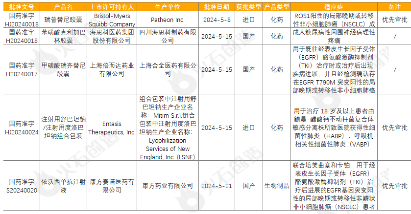 截至2024年6月5日NMPA披露,2024年5月共批准国产首次注册药品156件。按剂型去重后,共103个药品品种(不同厂家生产同一药物按同一品种计算)。本月有5个品规(5个品种)1类创新药获批,4款为化药,1款为生物制品。2024年5月NMPA批准的1类创新药情况见表2。